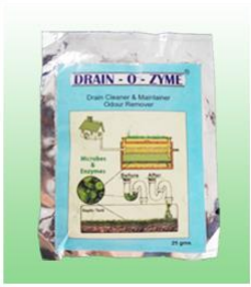 DRAIN-O-ZYME is a powder based on microorganisms,enzymes and nutrients which effectively liquefies and breaks down Proteins,Carbohydrates, Fats and Organic Waste to Carbon Dioxide and Water.